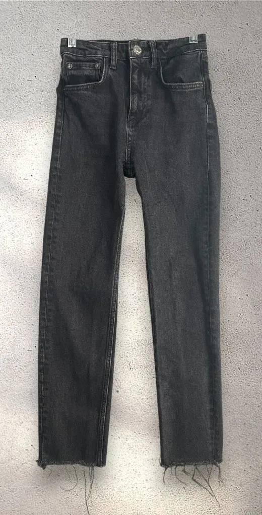 zara high rise black straight jeans 🖤 classic high-rise fit with a straight leg and raw hem for tha... Show more