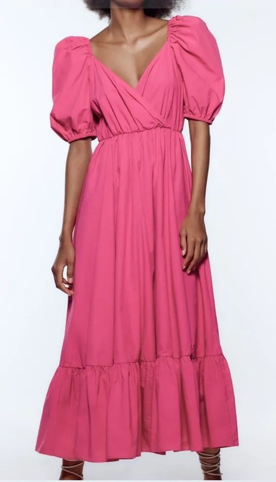 ZARA Hot Pink Puff Bubble Sleeve Tiered Midi Dress Flowy Barbie Feminine XS Pre-owned, great condit... Show more
