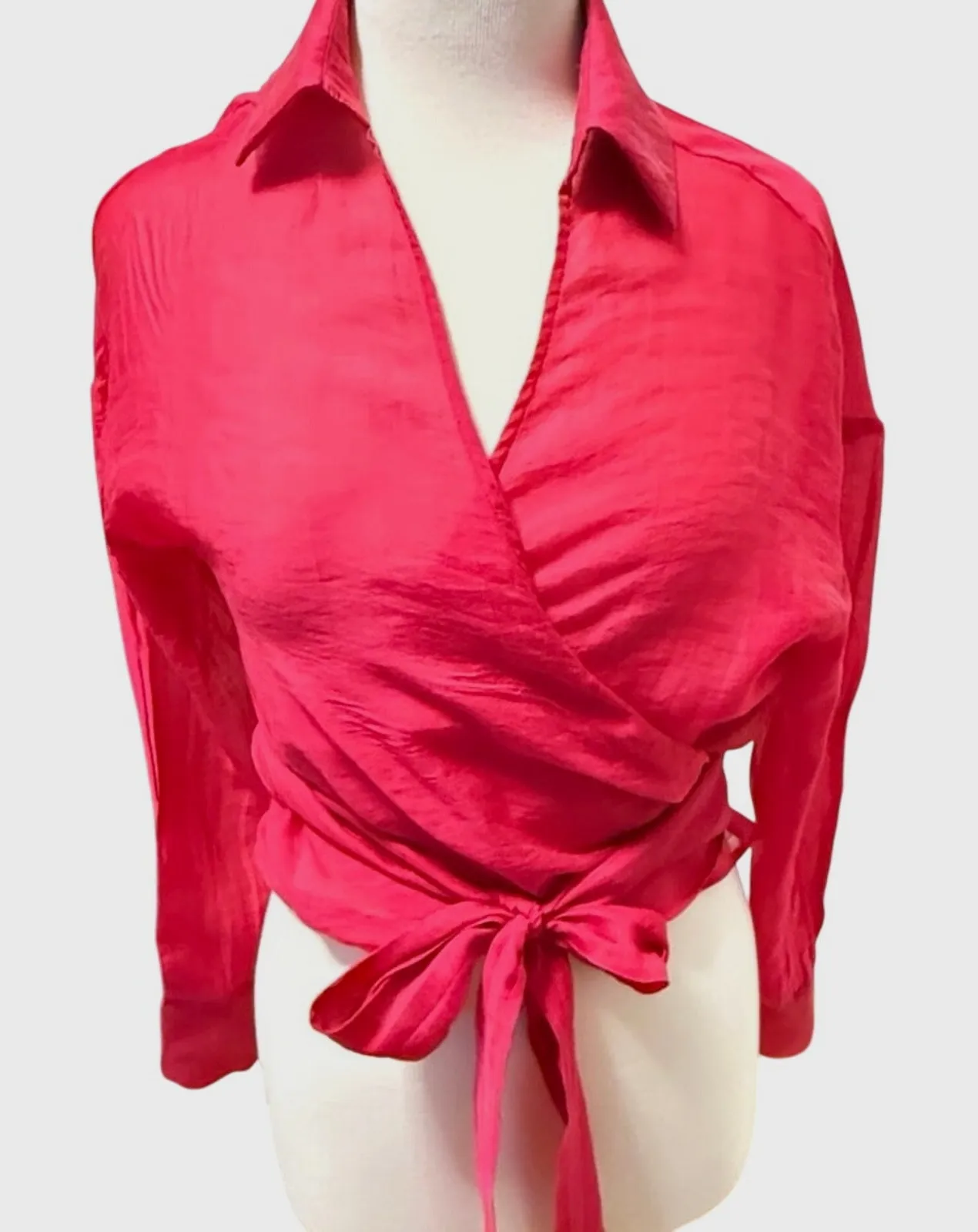 This blouse features a crisp collar and a stylish tie wrap design for a polished look. Made from bre... Show more