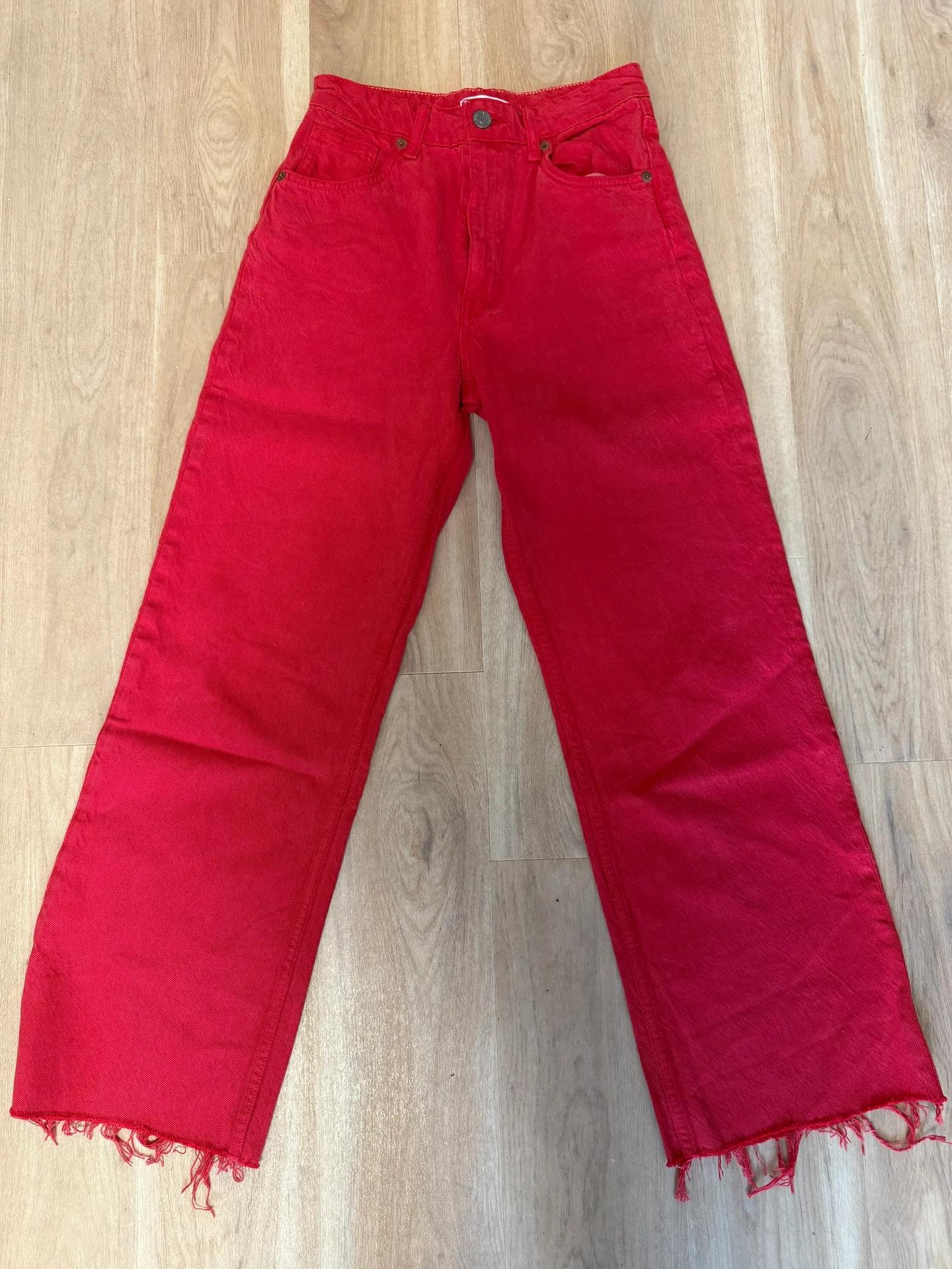 Could fit a 4-6 (run a little small) Red wide leg jeans with distressed bottom Fit nicely