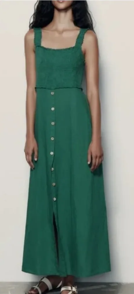 Zara Kelly Green Smocked Linen Blend Maxi Dress Women's Small Cottage Prairie
