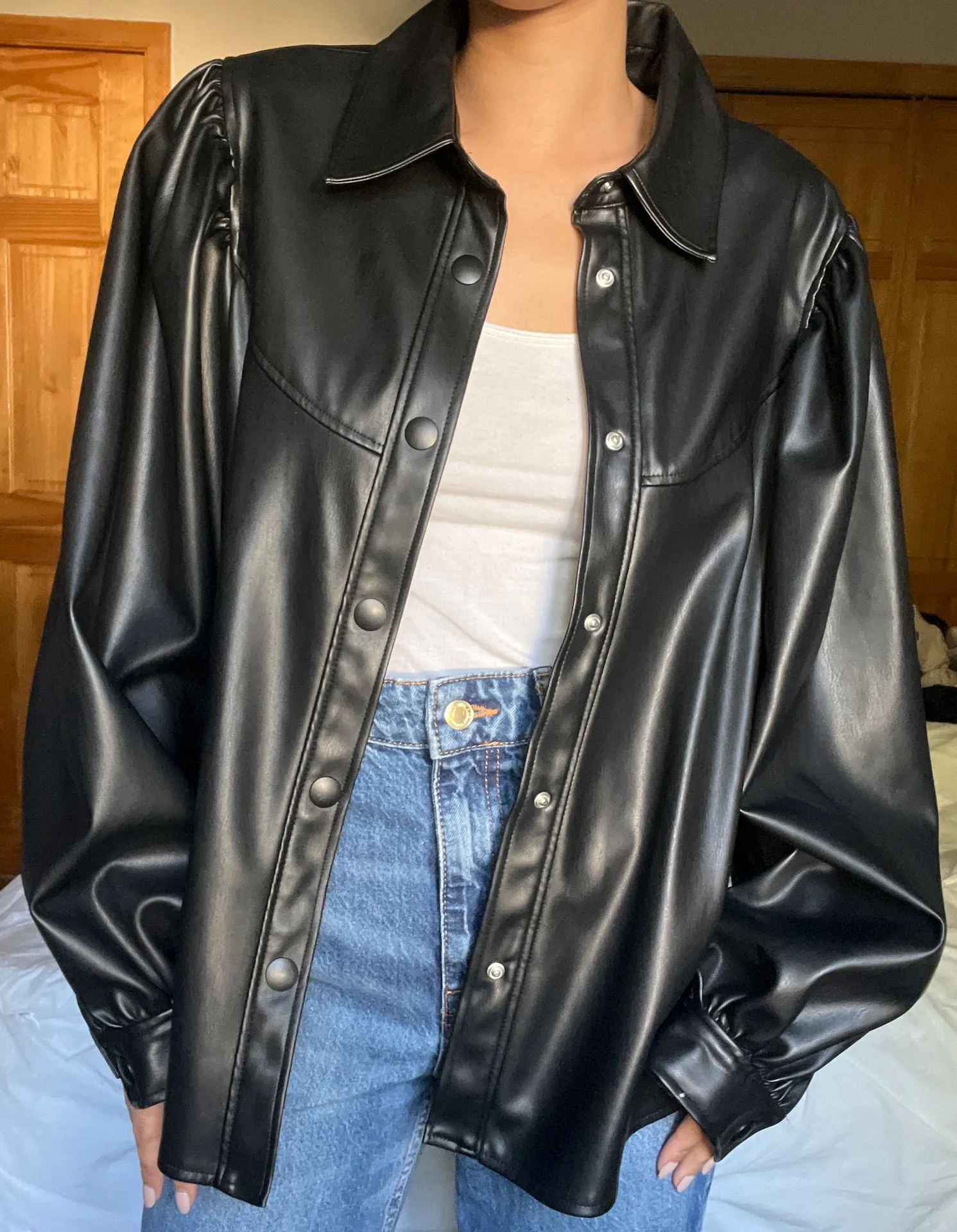 Zara faux leather shacket puff/balloon sleeve. Snap buttons. Super soft leather. Good condition. B... Show more