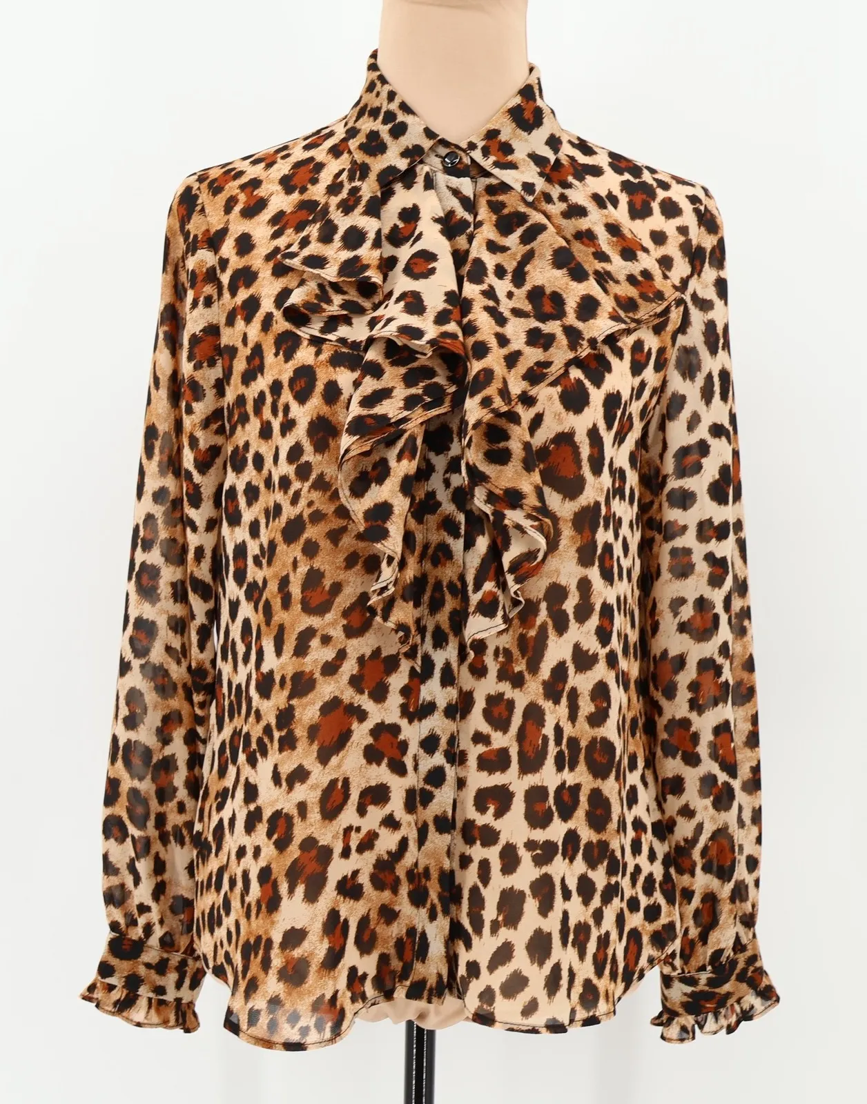Lightweight sheer leopard print blouse with ruffle front detail — a chic, statement top perfect for... Show more