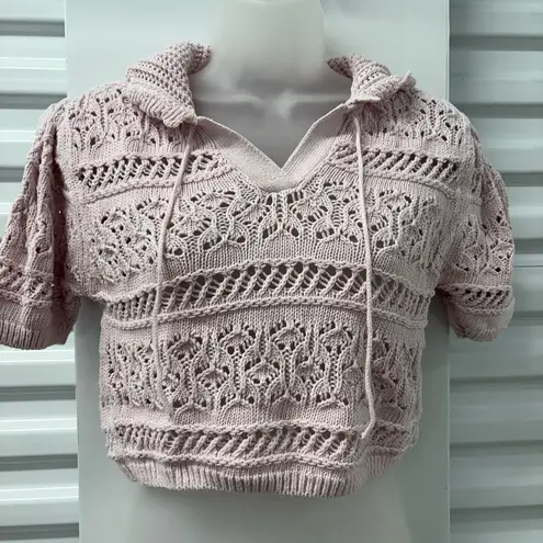 Elegant light pink knit sweater with intricate design. Soft and comfortable fabric.