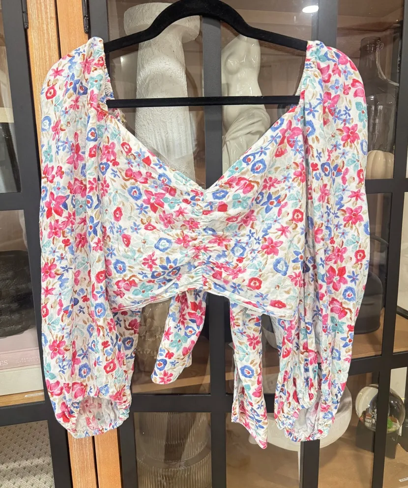 Zara linen cropped top tie open back floral bow puff sleeve balloon long ruched Pink - $20 - From Filo