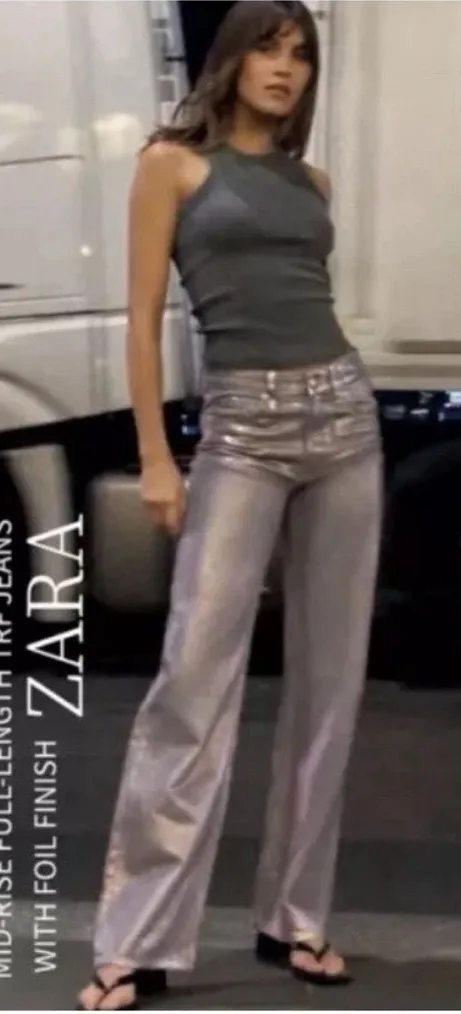 Zara Mid-Rise Full-Length TRF Jeans with Foil Finish. They are pink hue-colored, feature a mid-rise... Show more