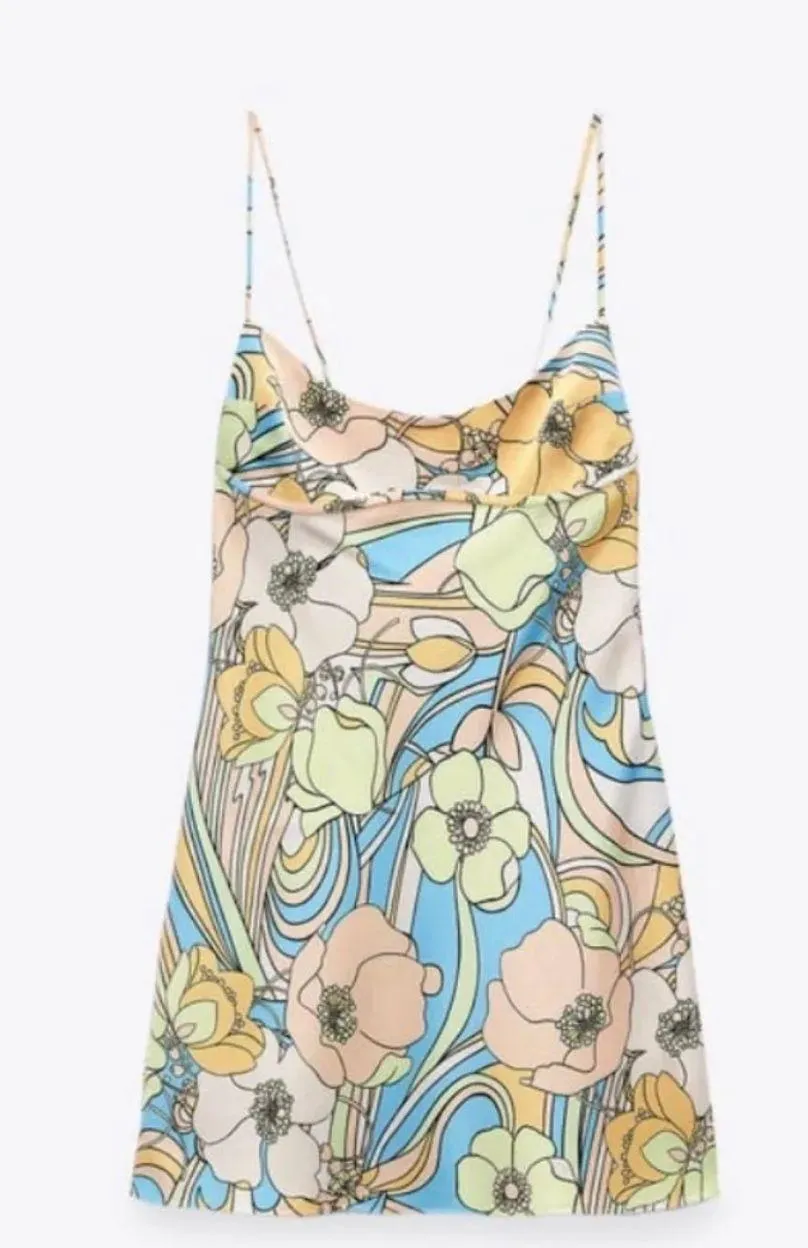 Really cute, colorful mini dress from Zara. Straps NOT adjustable. Worn once, minor pull from altera... Show more