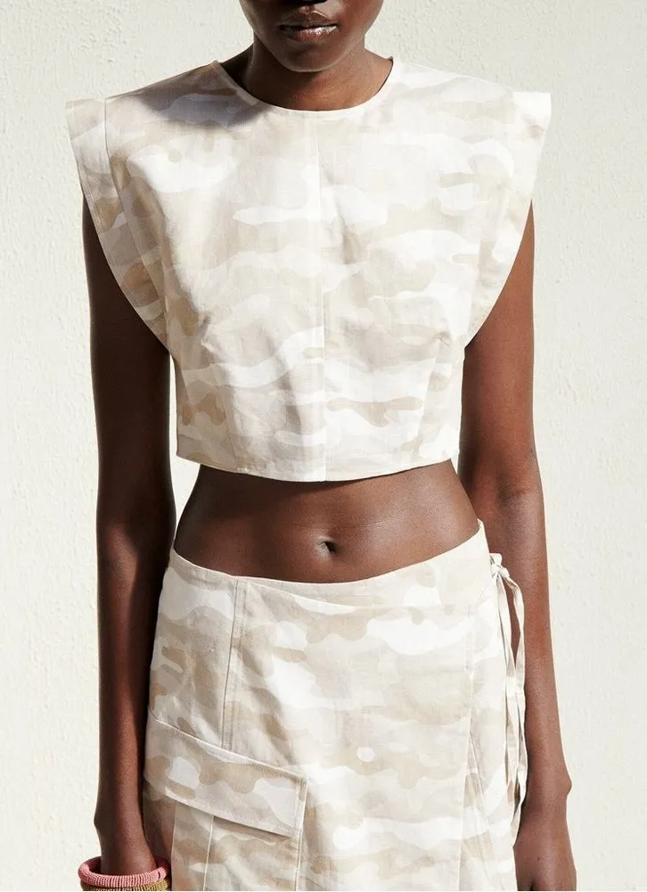 ZARA cropped camo print top Linen & cotton blend Short sleeves Back zipper Boxy fit Neutral Size... Show more