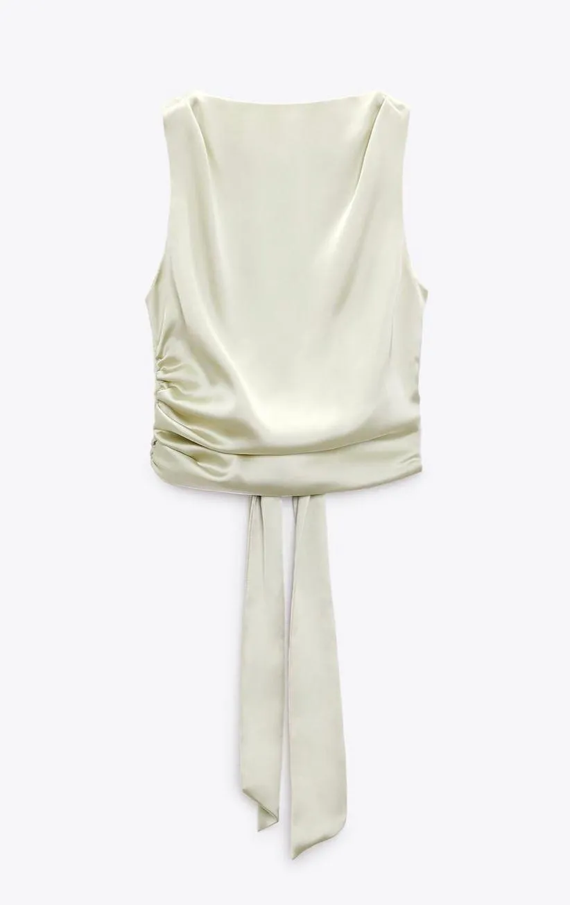 Sleeveless, round neck top. Open back detail and tie at hem.