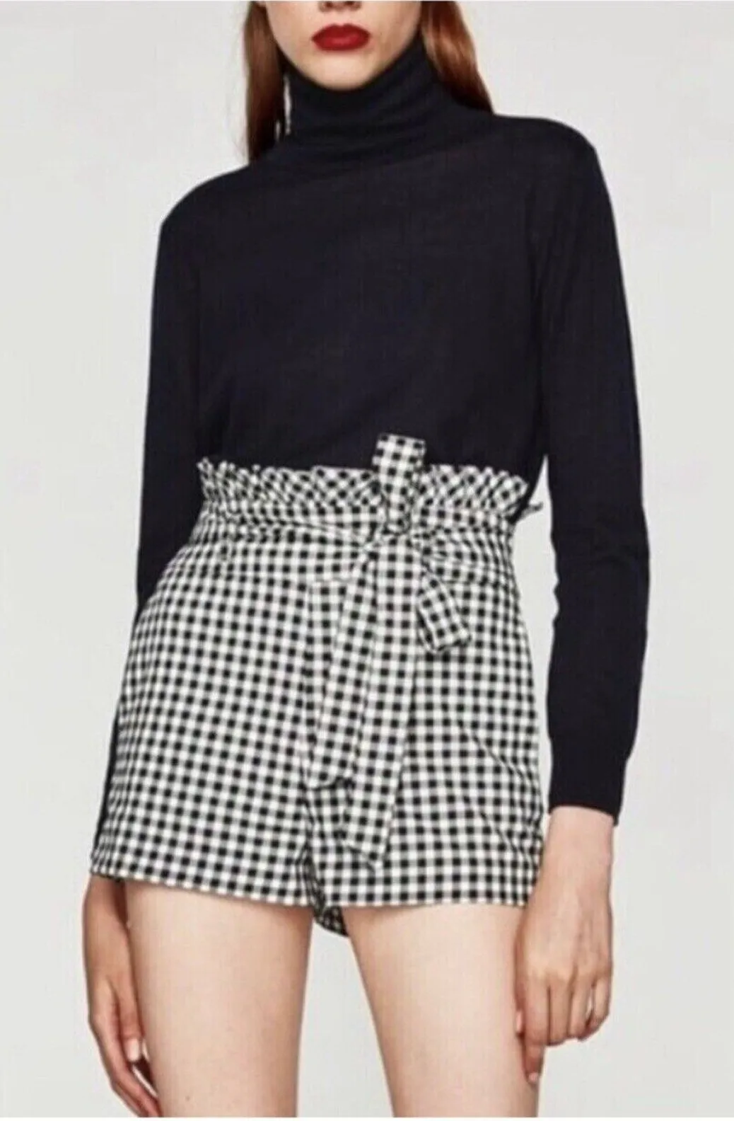 ZARA Paperbag Checker Tie Shorts Hi Waist Ruffles Side Zip Pockets S Black White Excellent pre-owne... Show more