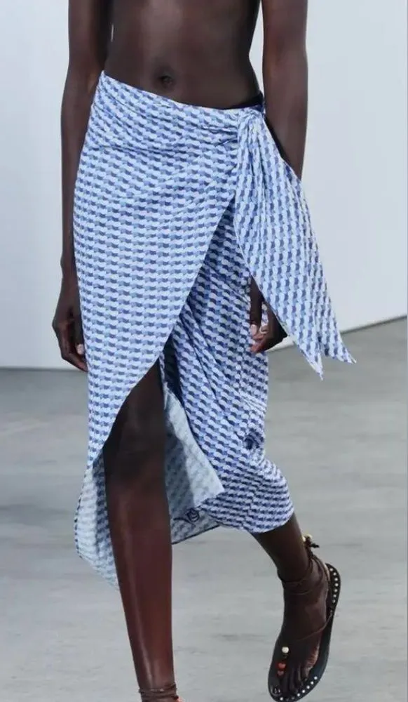 Zara Blue geo print, linen blend midi wrap skirt with yellow and light lavender accents. Adjustable... Show more