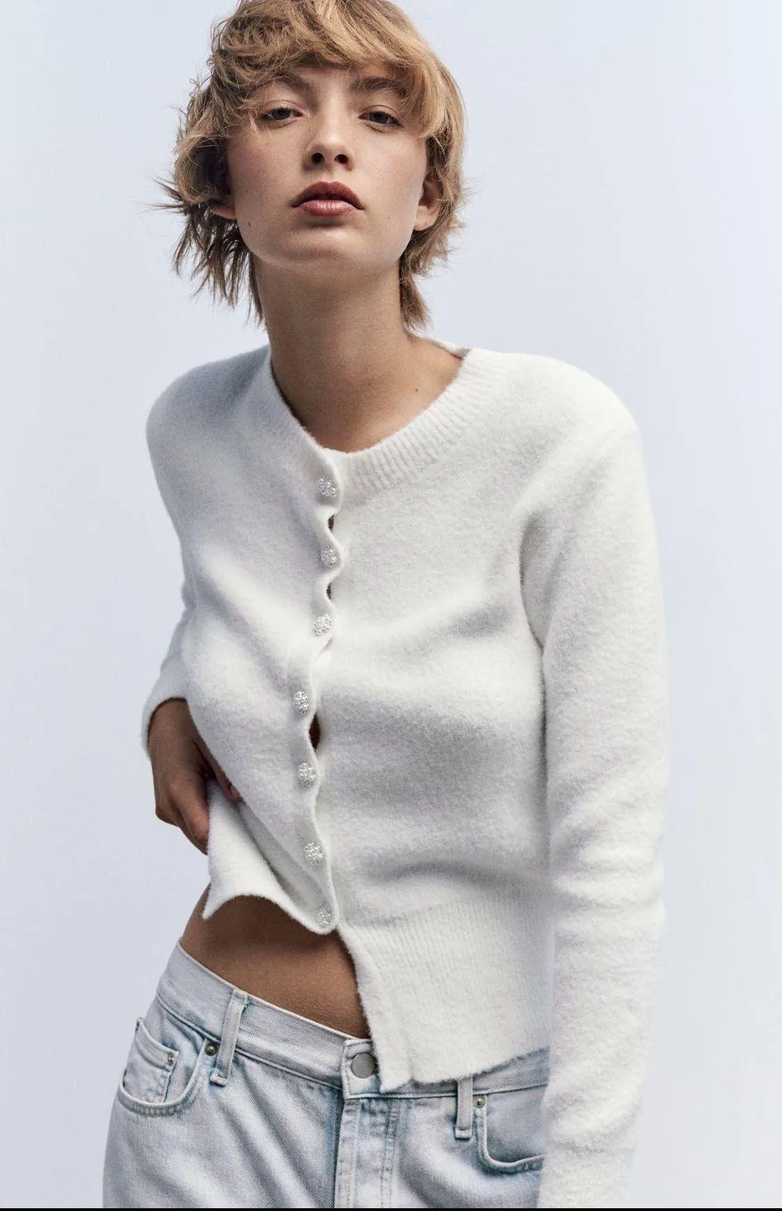 Super cute and trendy white pearl embellished zara cardigan!! worn a few times, lose thread on shoul... Show more