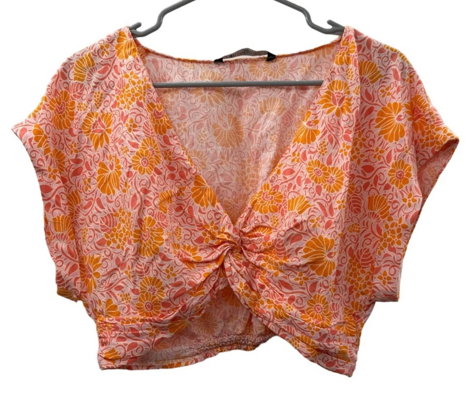 Zara Pink & Orange Bright Floral Print Twist Front Short Sleeve Crop Top Embrace the vibrancy of th... Show more