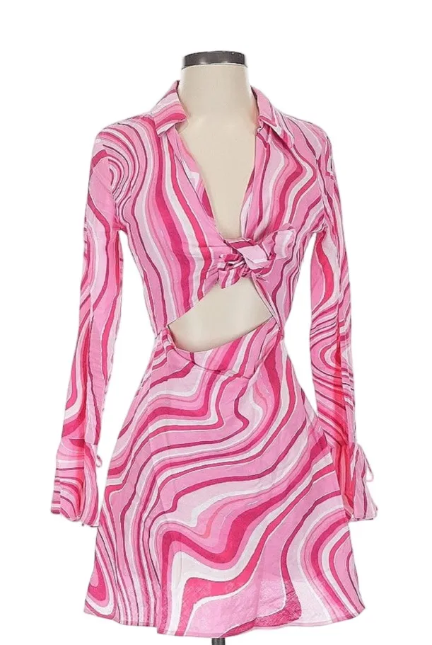 Vibrant and stylish Zara mini dress featuring a pink swirl print with retro-inspired vibes. Designed... Show more