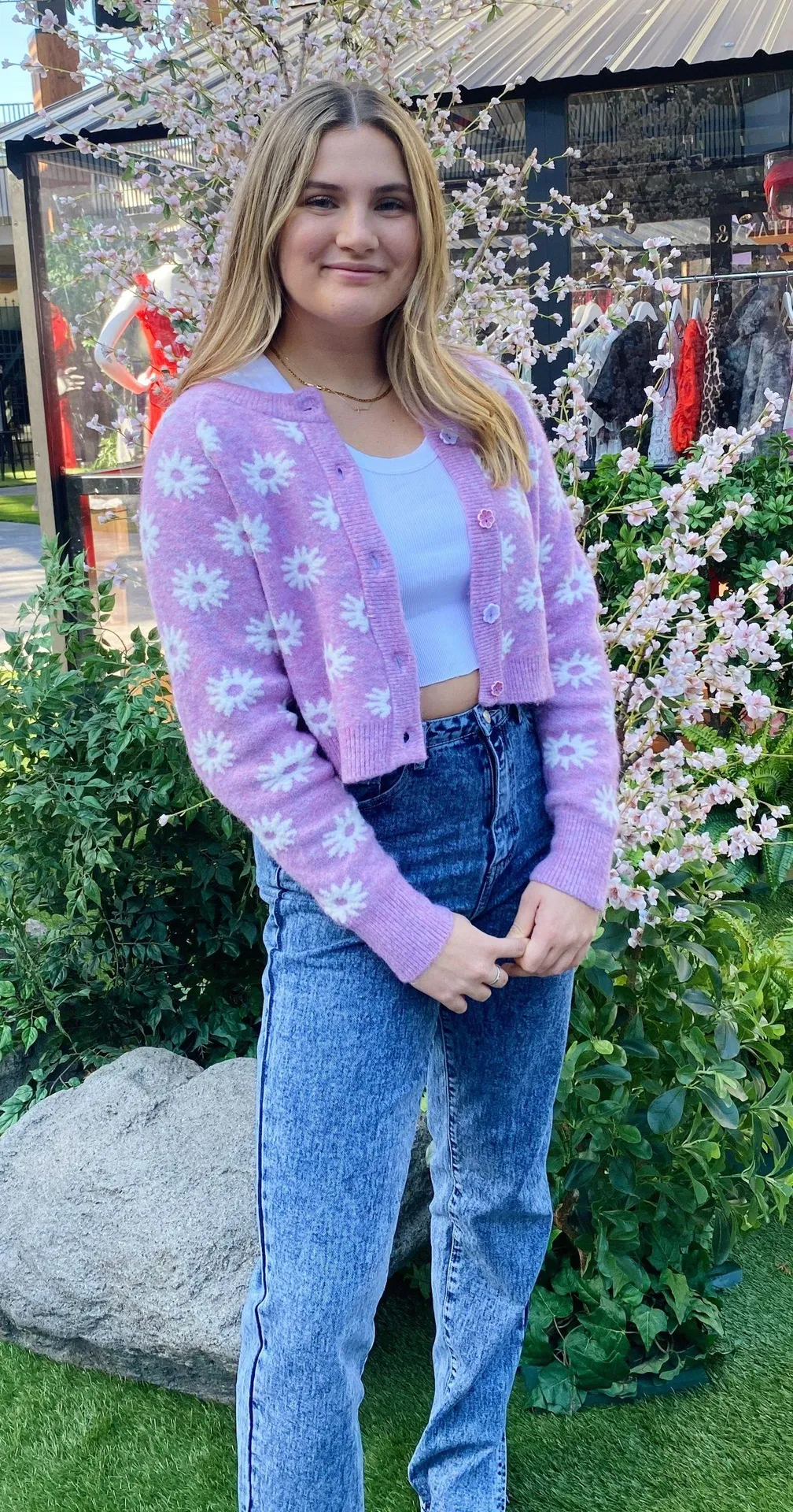 Cute white flower detailing on fuzzy purple sweater.