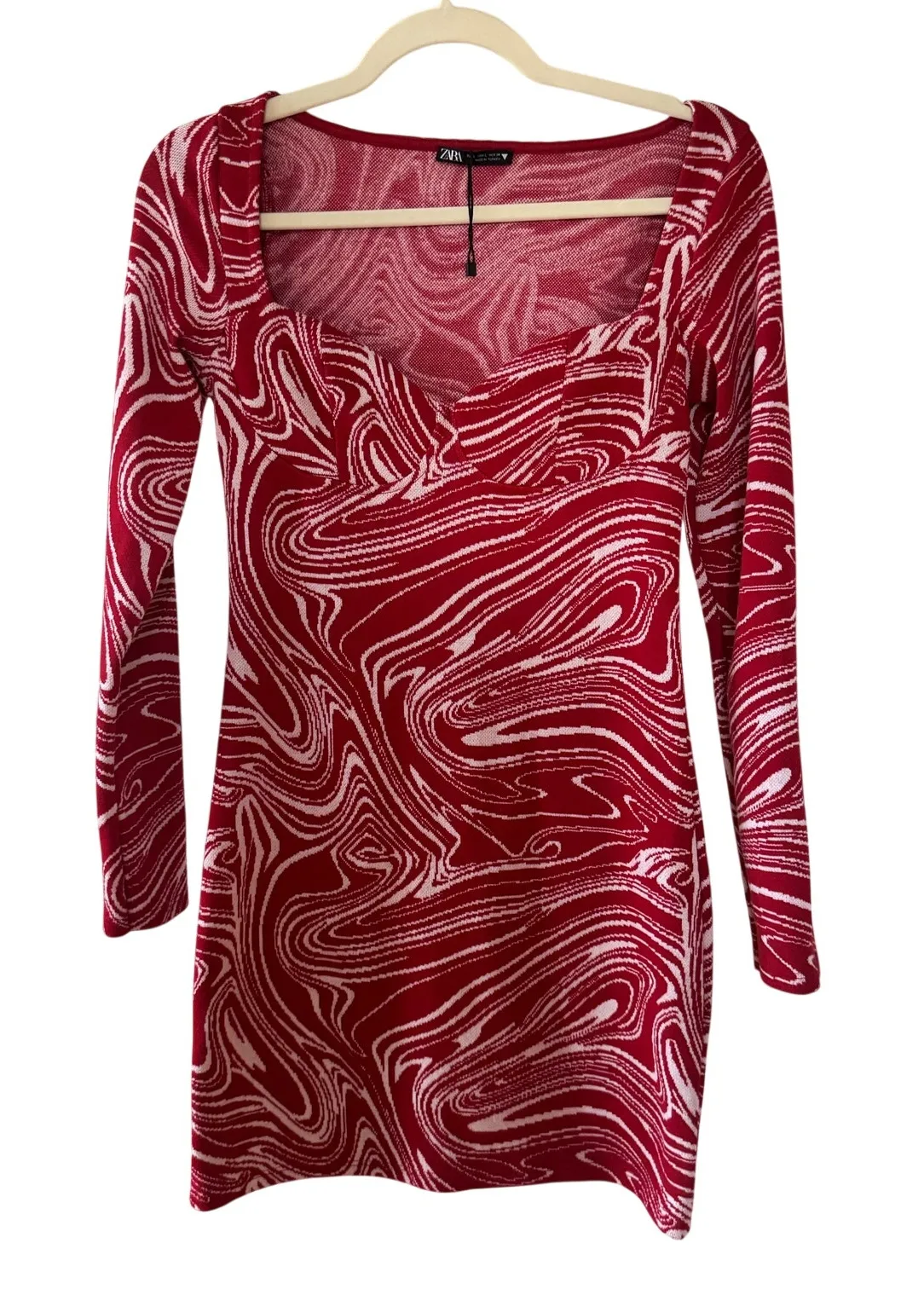 Zara Red White Abstract Square Neck Fitted Mini Dress Artsy Valentines Romantic Retro Size L PTP: 1... Show more