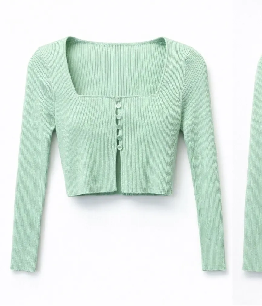 Zara ribbed knit cropped cardigan in a soft green shade with front button detail. Feminine, flatteri... Show more