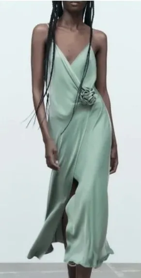 This stunning ZARA midi slip dress in sea green satin combines elegance and comfort with a sultry, soft-glow finish. Featuring delicate floral detailing, a cowl neckline, and adjustable straps, this dress drapes beautifully and feels as good as it looks. Perfect for weddings, vacations, or elevated everyday style.