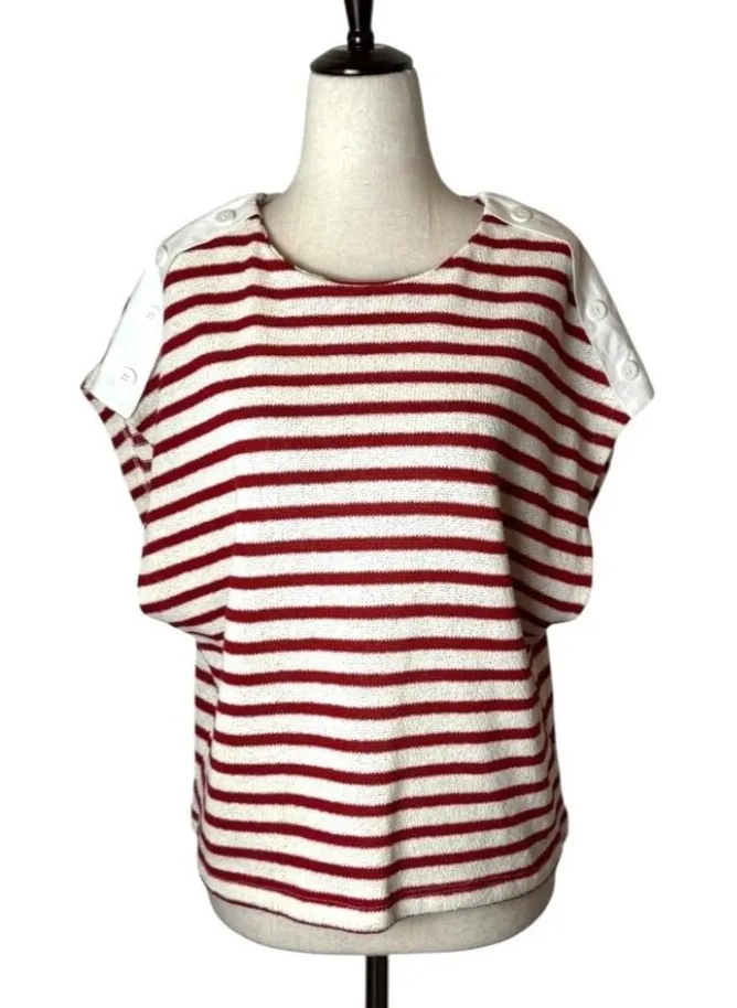 Zara Shirt Women Medium Red White Striped Knit Button Shoulder Top Coastal