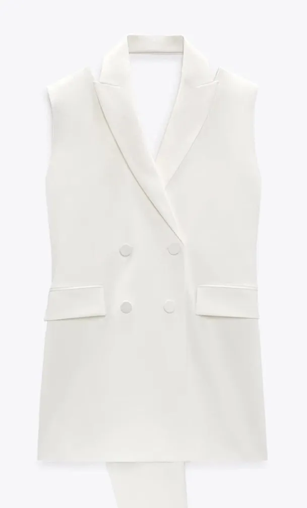 Short waistcoat dress with lapel collar. Front flap pockets. Opening details at the shoulder.