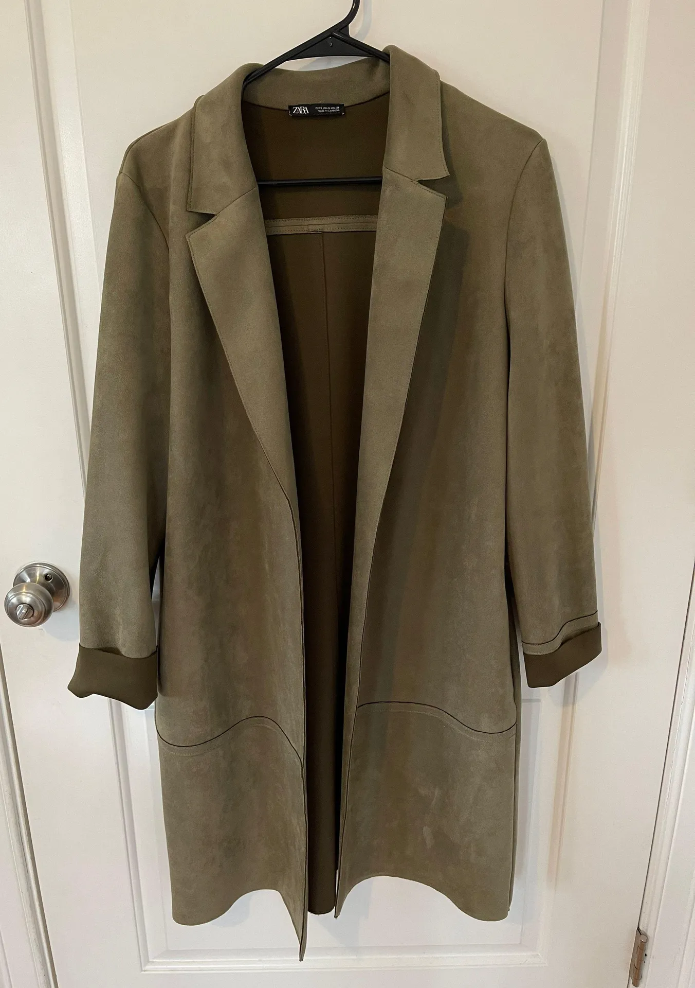 Open front. Like new. Has a stretchy material on the inside. Knee length