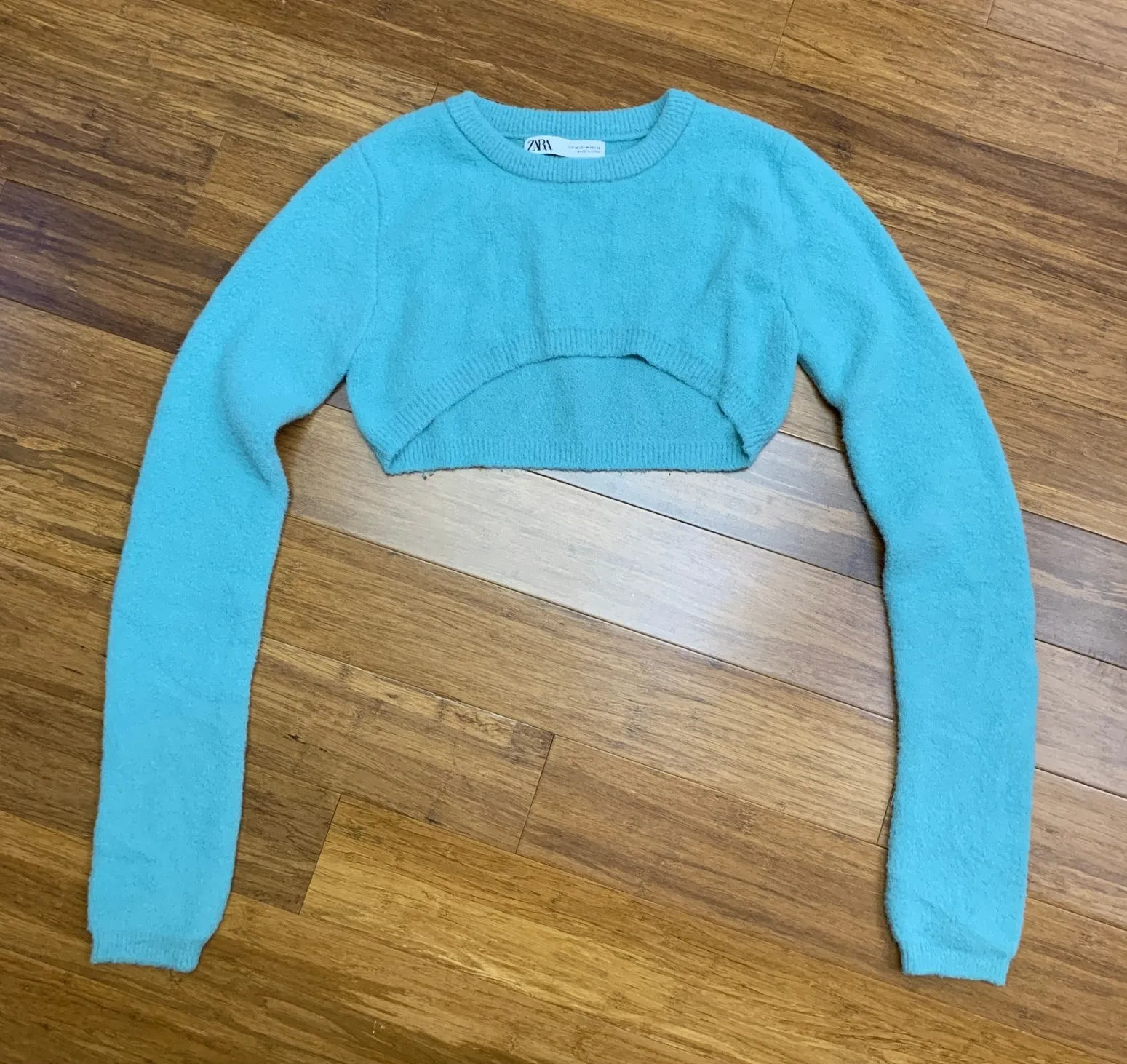 A fuzzy teal blue cropped sweater with long sleeves and a crew neck. This stylish top features an ul... Show more