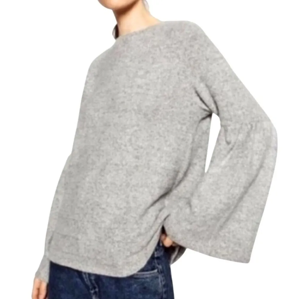This Zara sweater features an elegant bell sleeve design, adding sophistication to any wardrobe. The soft gray material ensures comfort and style, making it a versatile addition to both casual and professional settings.