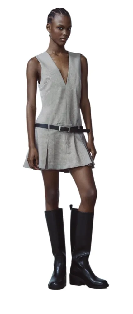 Zara Mini Dress V Neck Pleated Skirl Belt Zipper on back Sleeveless Checkered pattern New Without... Show more