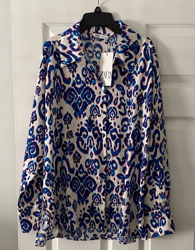 Eye-catching blouse with bold blue and white design. Ideal for versatile styling.(O6)
