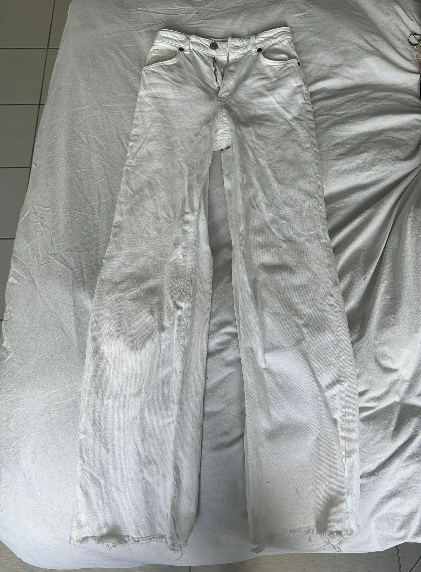 My favorite white Zara jeans, stains at the bottom legs and one small stain at the top *see pictures... Show more