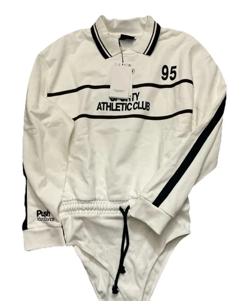 White top stripes and 'Sporty Athletic Club' print. Features a collared neckline.