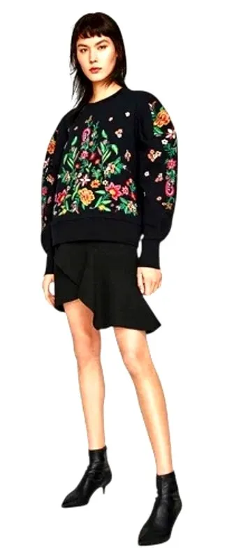 mall Oversized fit, in excellent pre loved condition, very minimal wear Embroidered with gorgeous flowers on front and on sleeves of top. Puff shoulders give this sweatshirt a feminine touch! Oversized fit Ribbed hem and end of sleeves Pullover style Measurements are APPROXIMATE and were taken laying flat: Size Small pit to pit: 22" Length: 24" shoulder to shoulder: 16" Sleeve length: 26" Materials: 80% cotton, 20% polyester