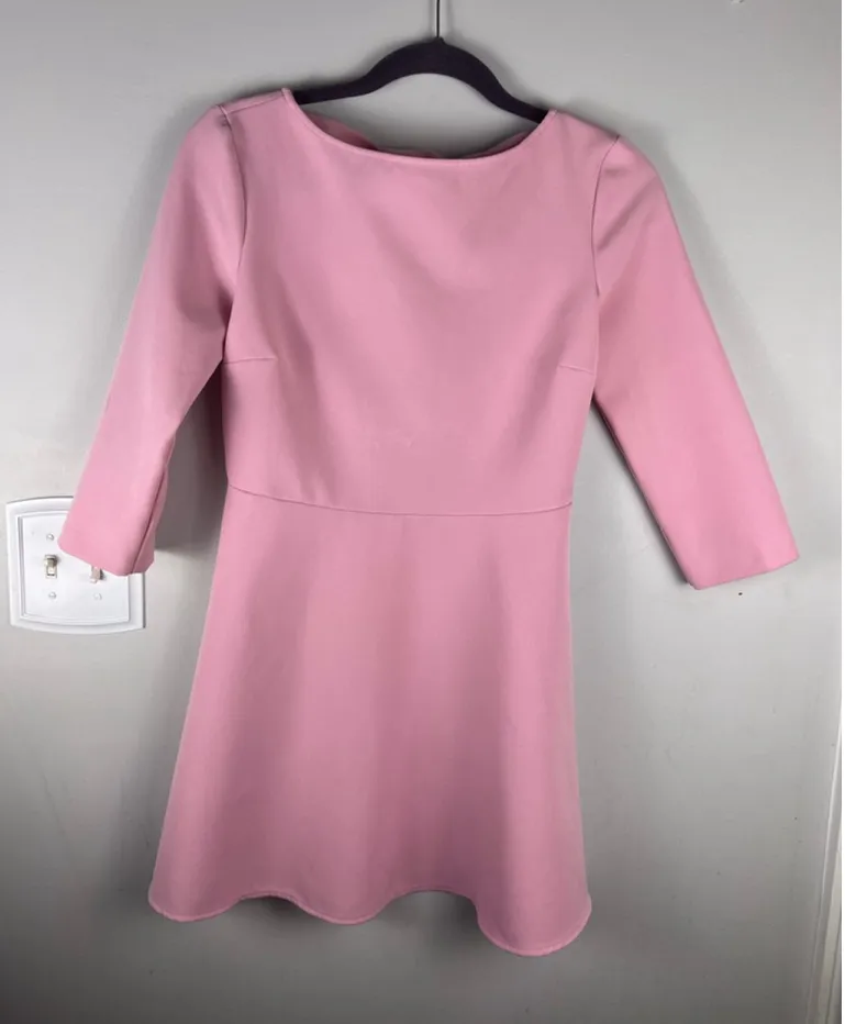 Brand: Zara (Zara Woman) Size: Women’s Medium (M) Tag: EUR M / USA M / MEX 28 Color: Blush / soft pink Details: • Elegant A-line silhouette • Statement open back with three bow accents • 3/4 length sleeves • Structured ponte-style knit fabric with stretch • Pull-on style • Knee length (approximate, depending on height) Condition: Excellent pre-owned condition. No stains, holes, rips, or odors noted. Bows and seams are intact. Please review all photos carefully for condition and style details. Fabric & Care: Polyester blend (typical Zara ponte fabric) Made in Turkey This is a ZARA WOMAN pink mini dress, size M, featuring a boat neck front and a distinctive open back design with three decorative bows. The dress has three-quarter length sleeves and a flared skirt. The fabric appears to be a solid, smooth material. No visible imperfections or signs of significant wear are apparent in the provided images. The garment label indicates "MADE IN TURKEY."