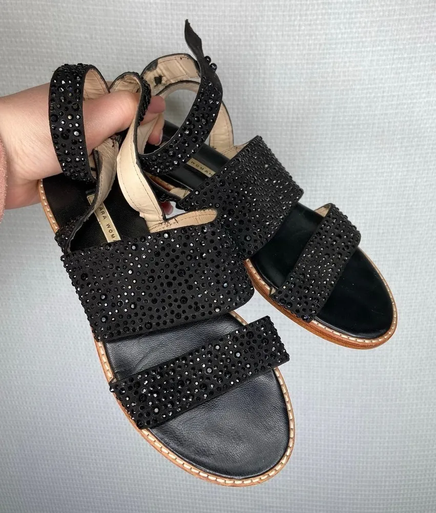 Zara Woman | Black Strappy Sandal Jewel Black sparkle slip on sandals ankle straps Chunky soul A... Show more