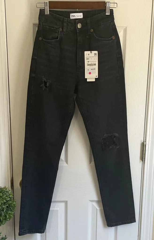 Zara streetwear black/charcoal jeans with distressed details. Modern and edgy style. Waist is 12 inc... Show more