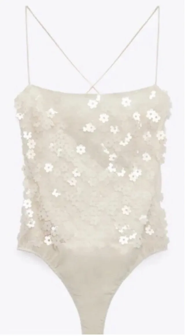 Zara Womens Bloggers Favorite Floral Applique Sequin Bodysuit Lace Up Back XL in Ivory. Good preown... Show more