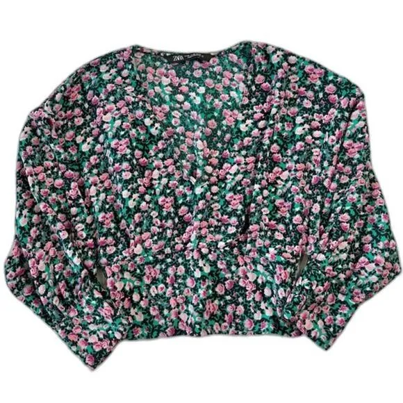 Picturing the Floral Crop Top by Zara! Brand Name: Zara Size: XS, Extra Small Color: Teal Black Pin... Show more
