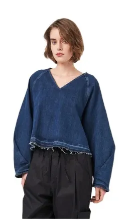 frayed hem, V-neck, long sleeve, denim top, cropped, boxy fit, casual chic, Zara, blue top, modern wardrobe, cotton blend, made in Turkey, versatile, layering piece, spring fashion, fall style, contemporary, streetwear, outfit ideas, staple top, minimalist, soft denim, quality fabrics, trending, elevated basics