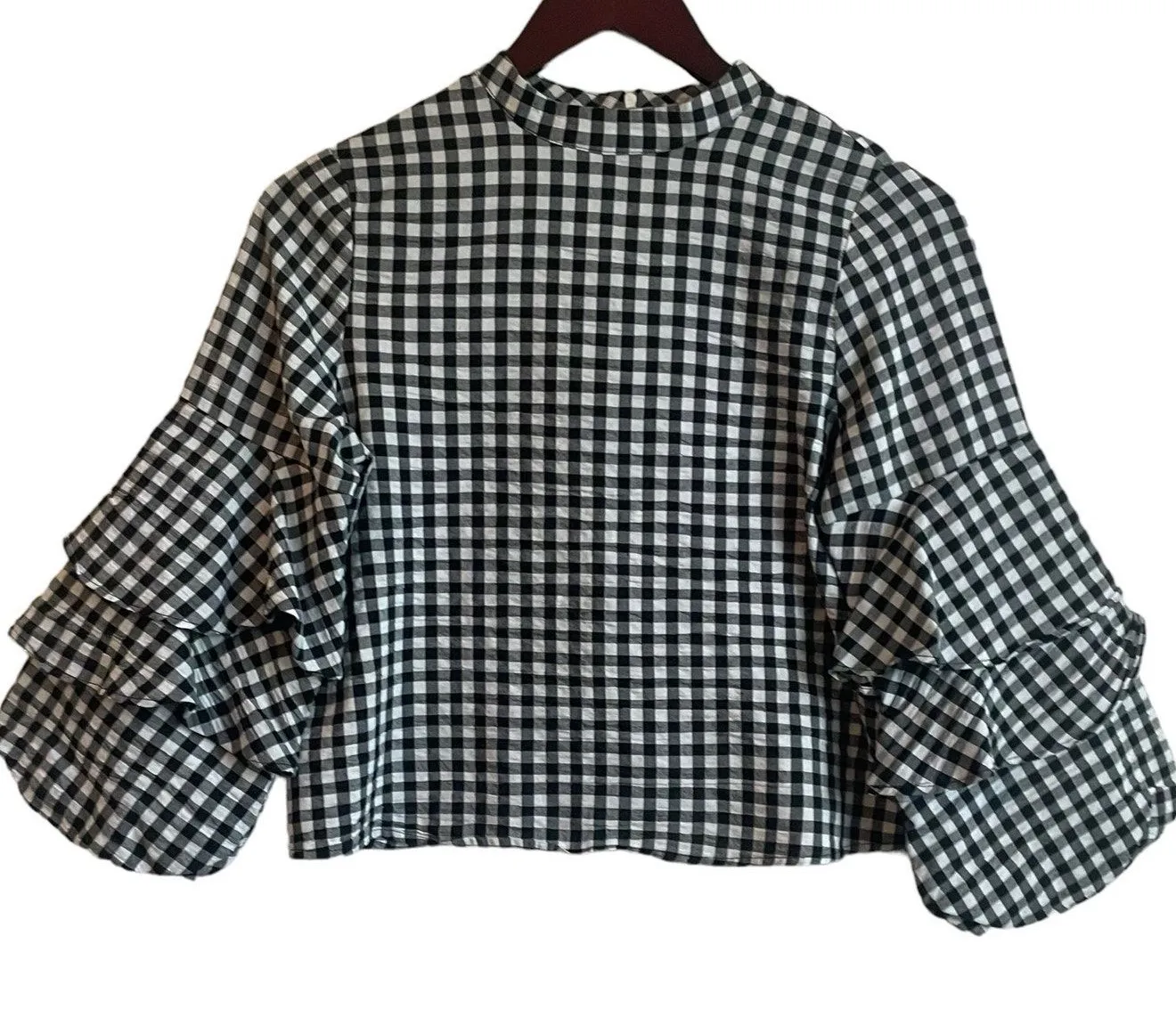 Zara Womens Crop Top XS Black White Gingham Check Ruffle Sleeve Preppy Coastal Great Pre-Owned Condi... Show more