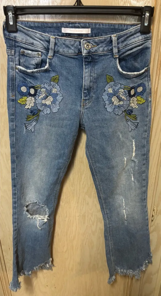 The Zara Women’s Embroidered Floral Fringe Distressed Denim Jeans in size 4 are a stylish and versat... Show more