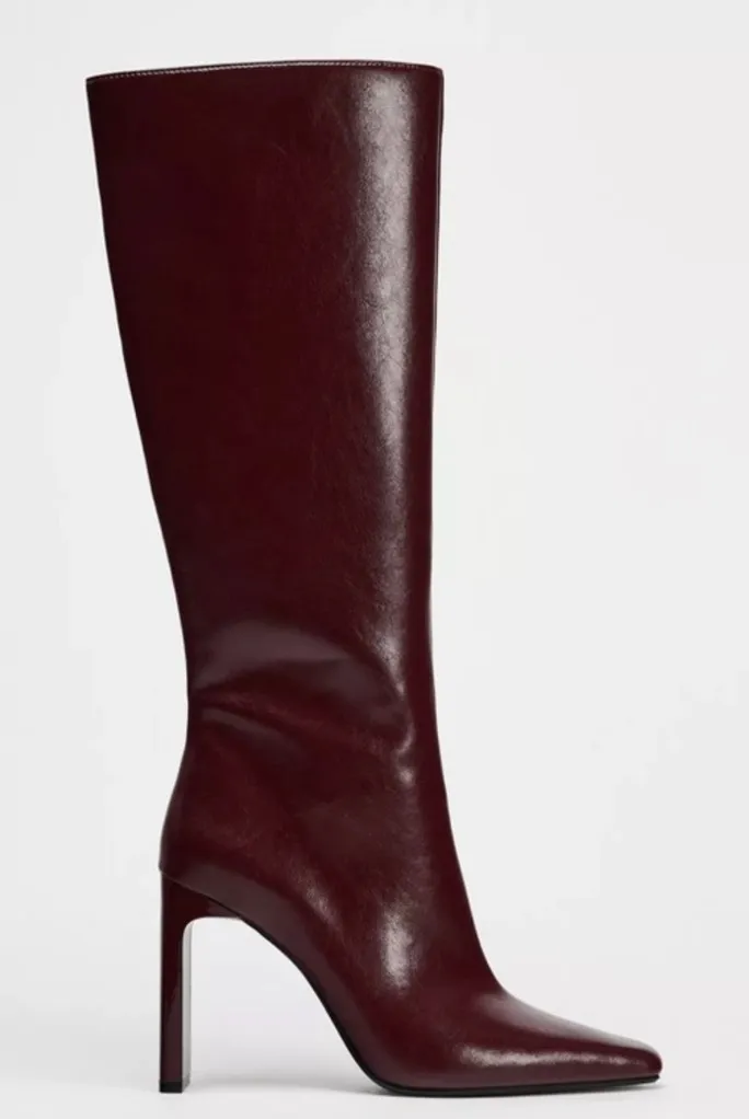 ZARA Women’s Faux Leather Knee High Burgundy Boots with Wide Heel. Tall burgundy boots with full in... Show more