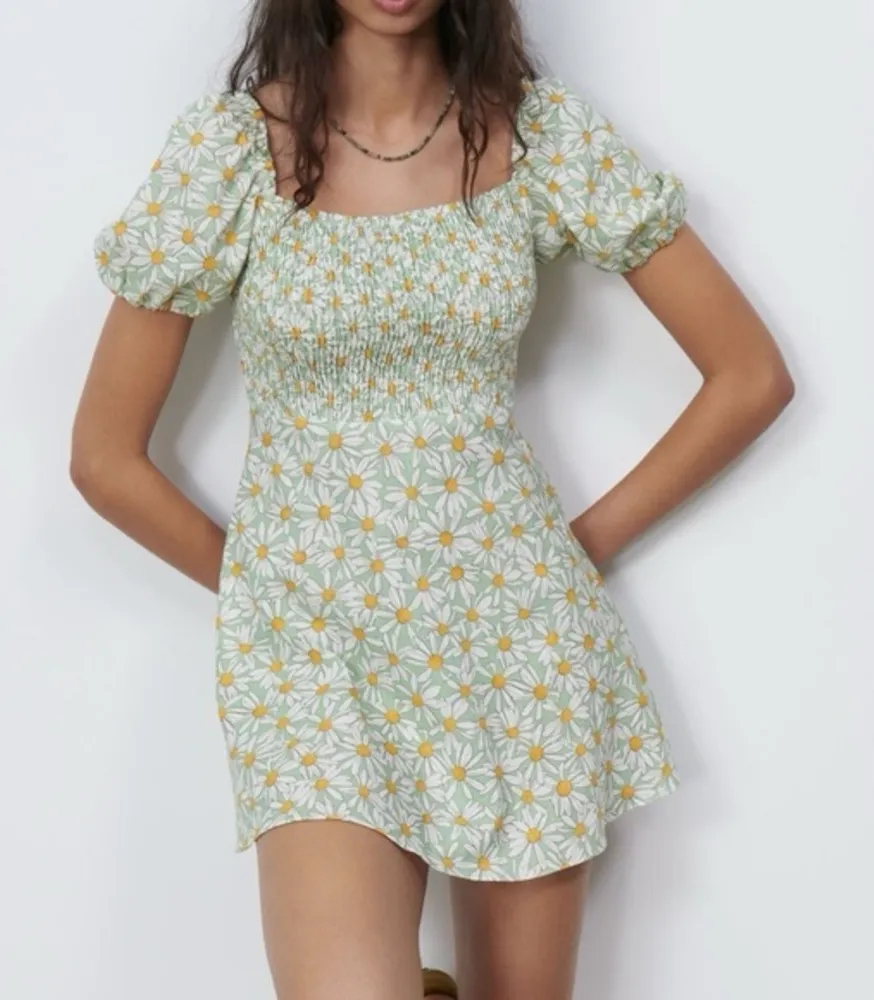 Zara Women's Green Square Neck Sunflower Mini Dress Size XS Great pre owned condition, only worn a... Show more