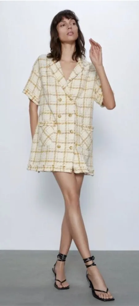 Excellent condition. Ivory white, yellow and beige tweed plaid. Double breasted button front blazer... Show more