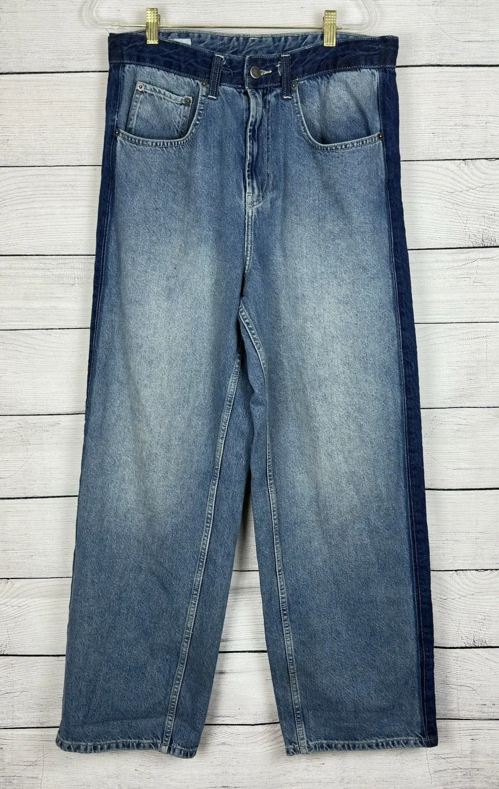 Details: • Brand: Zara • Style: baggy, straight leg, contrast outline • Color: two toned blue •... Show more