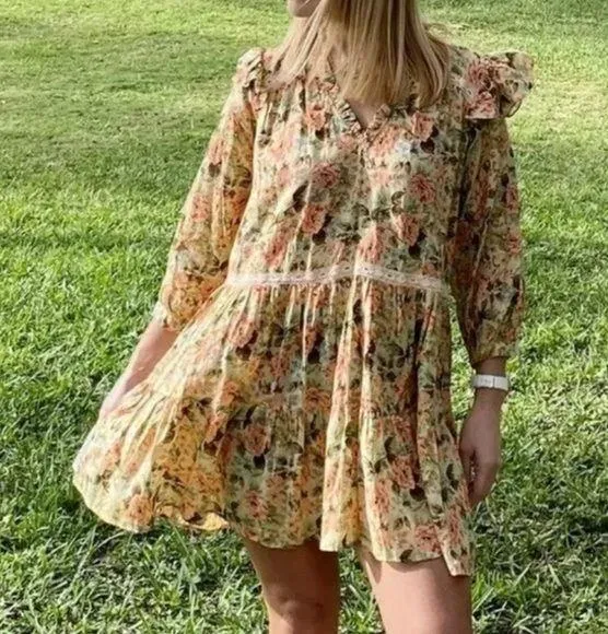 ZARA YELLOW FLORAL PRINT FRILLED SHORT MINI DRESS WITH RUFFLES, SIZE XS - $32 - From T
