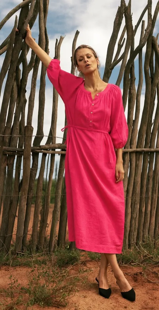 Tunic dress made from 100% linen yarn. Round neck and below-the-elbow puff sleeves with elasticated... Show more