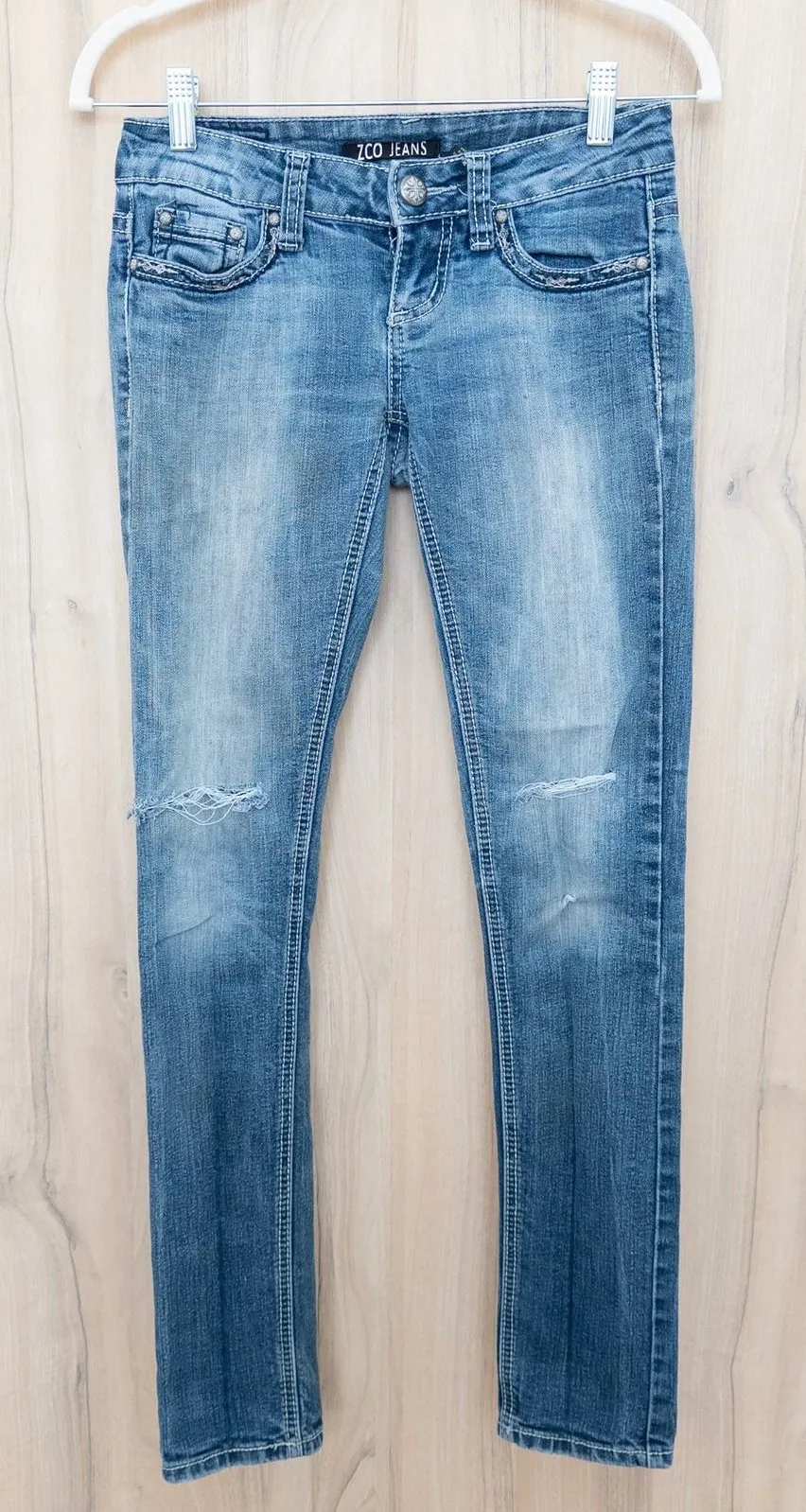 ZCO JEANS women's blue distressed skinny jeans. These jeans feature a light wash denim with strategically placed rips at the knees, adding a touch of edgy style. The back pockets are adorned with intricate silver-toned embroidery in a wing motif. Perfect for casual outings, concerts, or a stylish day out. Style: y2k, indie, casual, streetwear, embellished, beaded, mcbling Approximate Measurements (taken flat lay): Waist: 14" Rise: 7" Inseam: 31" Length: 37.5" Very good condition. Missing a button on one back pocket. See all photos for details. Ships next business day. Bundle deals available. Smoke-free home. Please check measurements before purchasing. SKU:4137