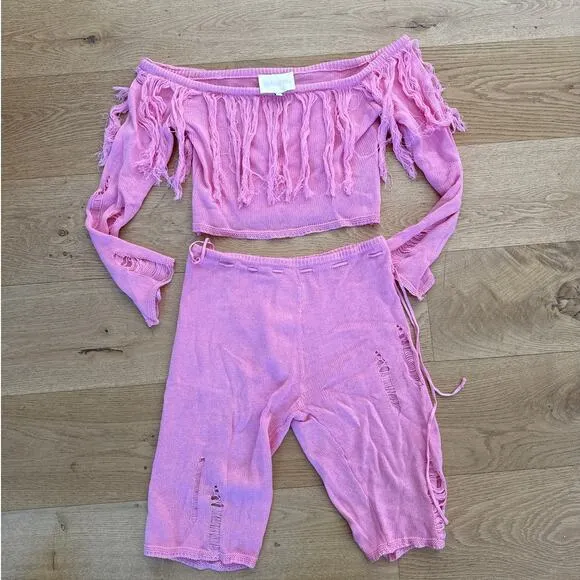 Zemeta - Bay Tassel Off Shoulder Knit Top & Soi Knit Ribbed Pants in Pink - $80 - From Dressed in