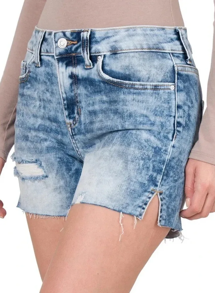 The perfect super stretchy denim cutoffs! These feature distressing on the thigh and on the back pockets, a raw cut hem that will fringe as you wear, medium rise and alot of stretch! Runs True to size Inseam: 4.5" Rise: 9.5" Material: 98% Cotton, 2% Spandex
