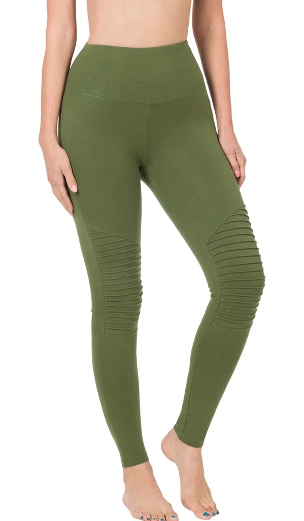 New in bag: only taken out of bag to photograph Feel comfortable on the go in Zenana's Moto Leggings! Zenana Cotton Wide Waistband Moto Legging OP-1818AB Features: High Waist Wide Band Cotton Blend Moto Design Hand or machine wash cold Tumble or hang dry. Details: FABRIC: 95% Cotton, 5% Spandex